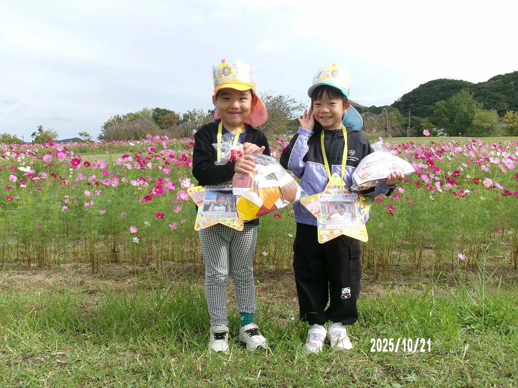 10月の誕生会はウチノ海総合公園で実施しました。にじ組は “ほし組を守ってあげようね”という優しい気持ちで車に近い道路側を歩き、ほし組は横断歩道の渡り方や歩き方をにじ組の姿から感じ取りながら、みんなで楽しく公園まで歩きました。満開のコスモス畑を目の前にした誕生会はいつもと違う雰囲気で、みんなワクワクした気持ちでお誕生の友達を祝いました。公園の中ではクヌギやマテバシイなどのドングリも見つけることができ、「すごいたくさん落ちているね」「このドングリは帽子をかぶっているよ」などと話しながら、夢中で拾ったドングリを園まで持ち帰りました。さわやかな秋風が心地よいこの季節、たくさんの自然にふれ、心が動く経験を重ねていきたいと思います。